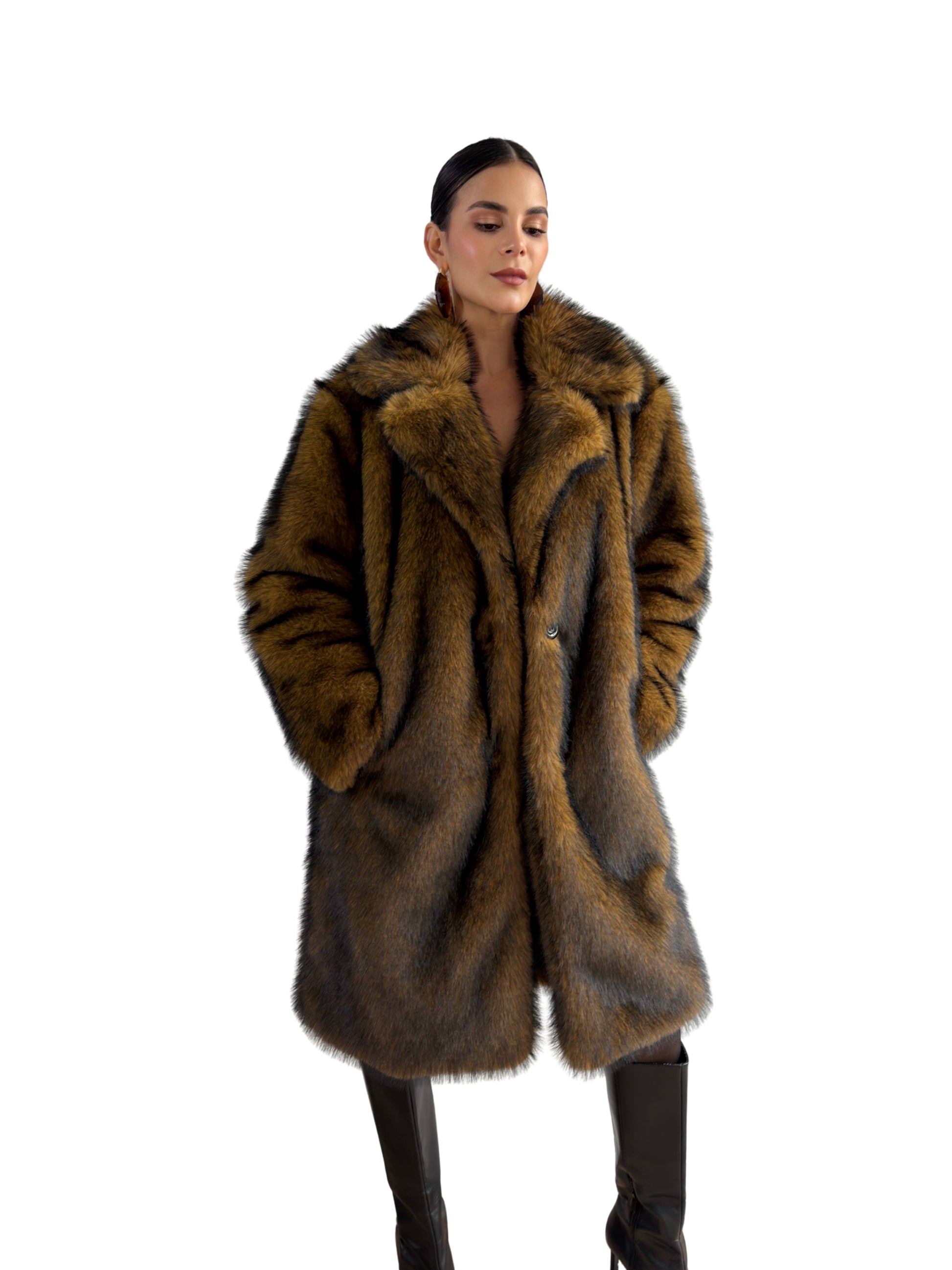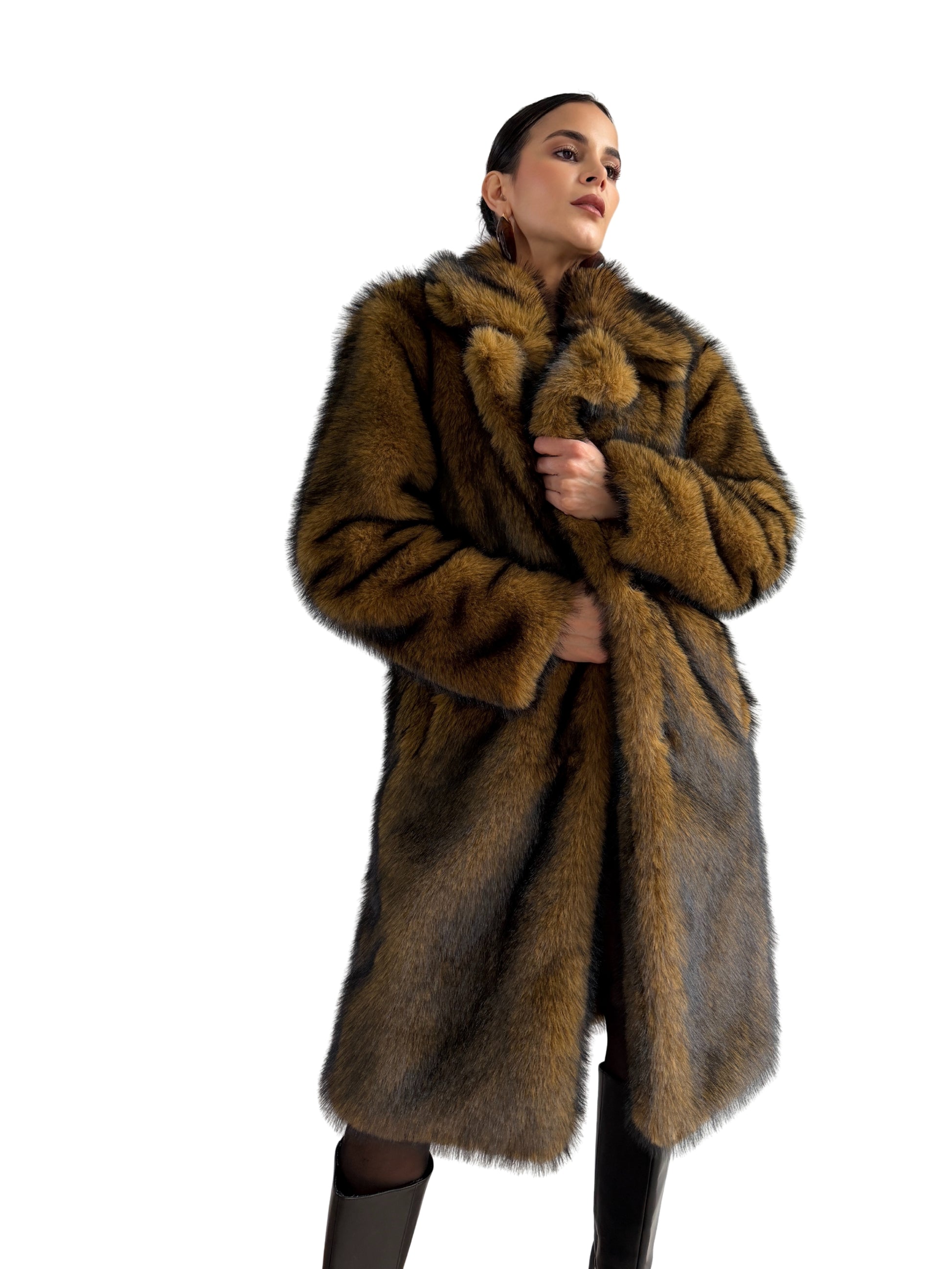 Descubre el equilibrio perfecto entre lujo, la elegancia y comodidad  con este abrigo largo marrón grueso. Sus pelos negros añaden profundidad y contraste, mientras que los destellos dorados que aparecen con la luz le otorgan un toque sofisticado y único. Los botones frontales no solo permiten un ajuste práctico, sino que también refuerzan su diseño elegante y clásico. Ideal para ocasiones especiales, algun viaje para un lugar de frio, este abrigo combina suavidad , estilo y presencia, convirtiéndose en una pieza única, es ese abrigo especial que te van admirar.