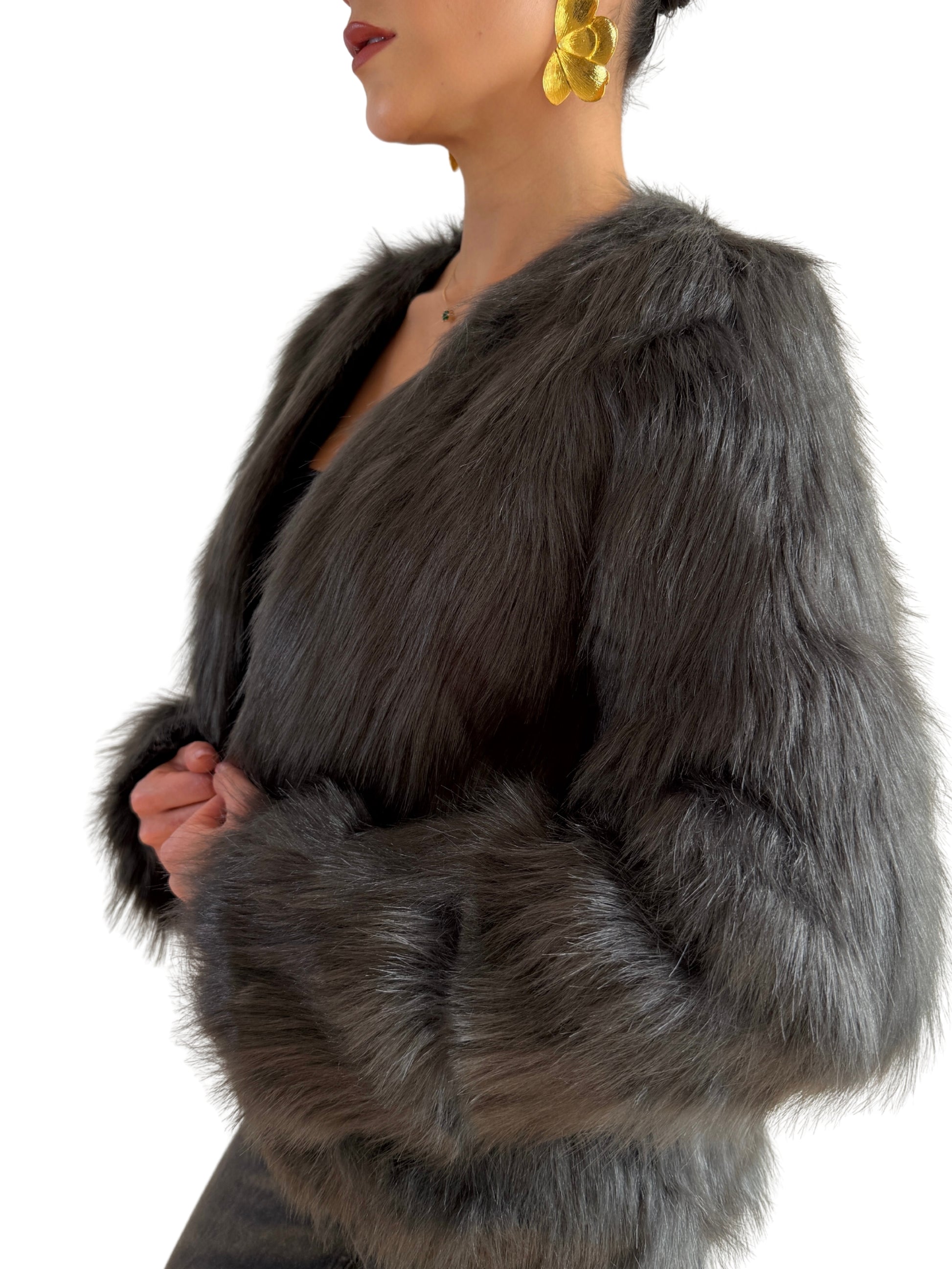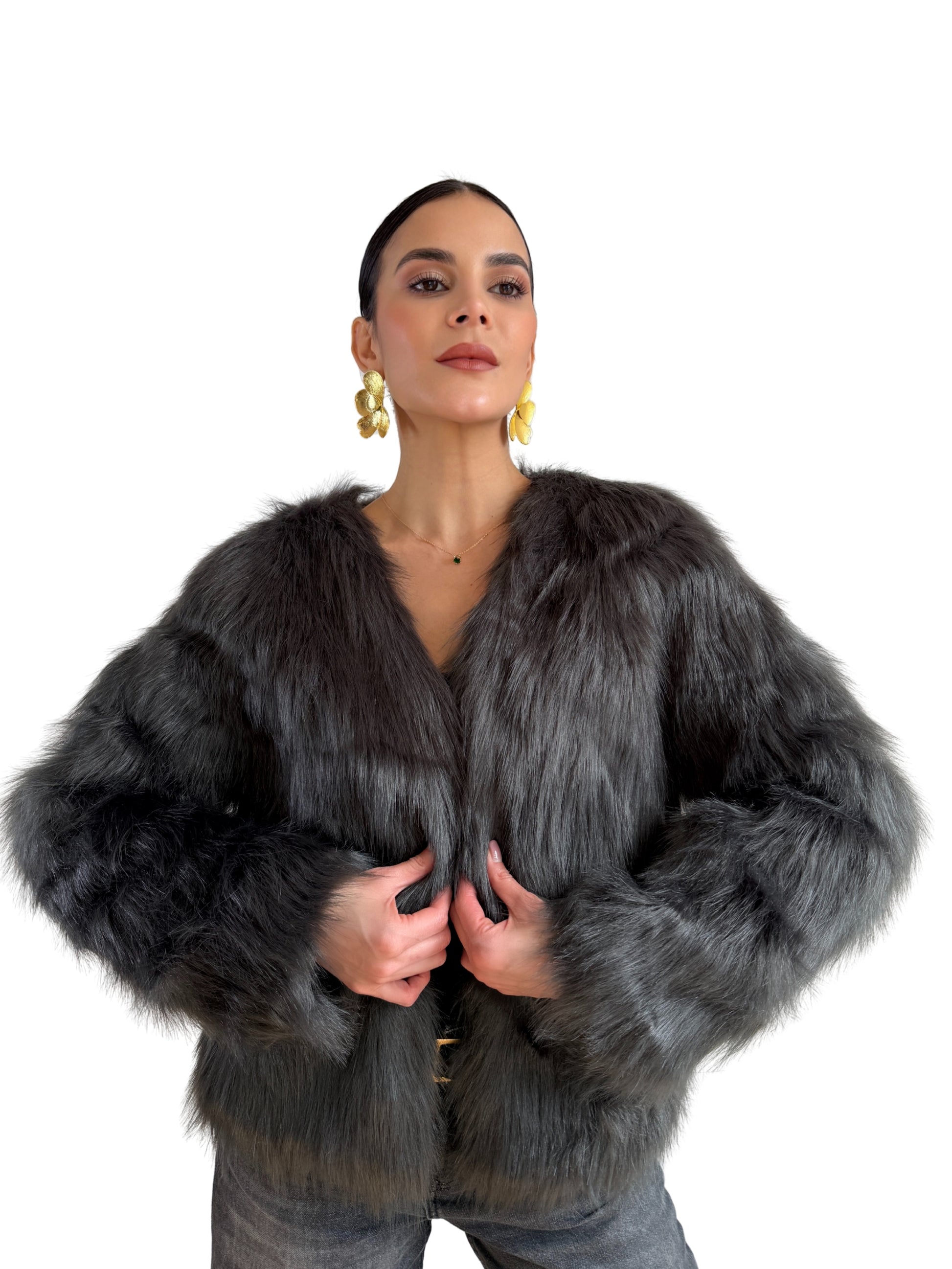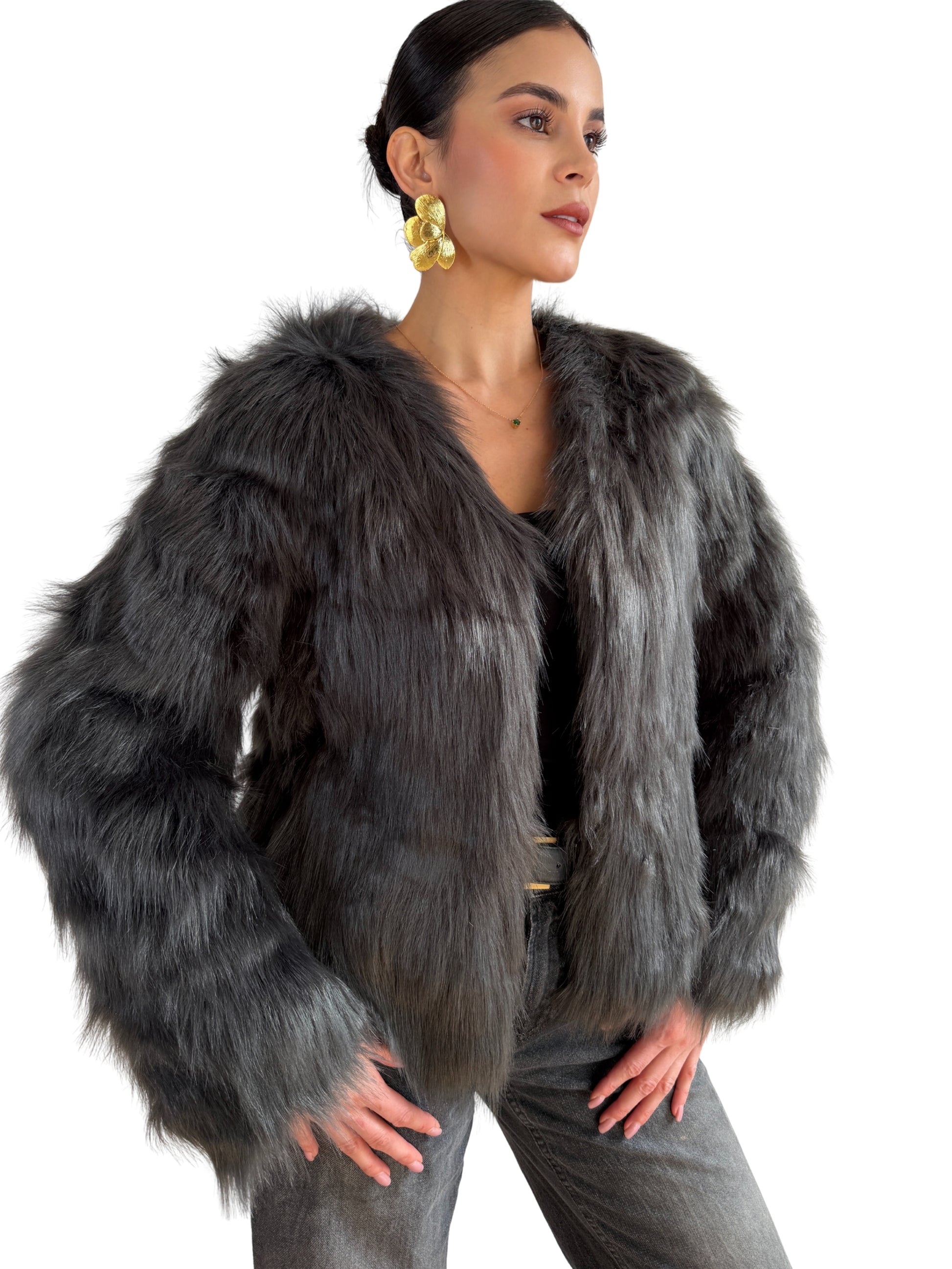 Eleva tu estilo con este abrigo gris oscuro de pelos largos, una pieza de alta calidad que combina elegancia, sofisticación y comodidad. Su forro con detalles de cuero en los bordes y los broches ajustables permiten un ajuste perfecto, aportando un toque de lujo y distinción. La textura suave y peluda ofrece calidez y confort, mientras que su corte cuidadosamente diseñado resalta tu presencia en cualquier ocasión. Ideal para quienes buscan una prenda exclusiva que une estilo, funcionalidad y calidad superior.