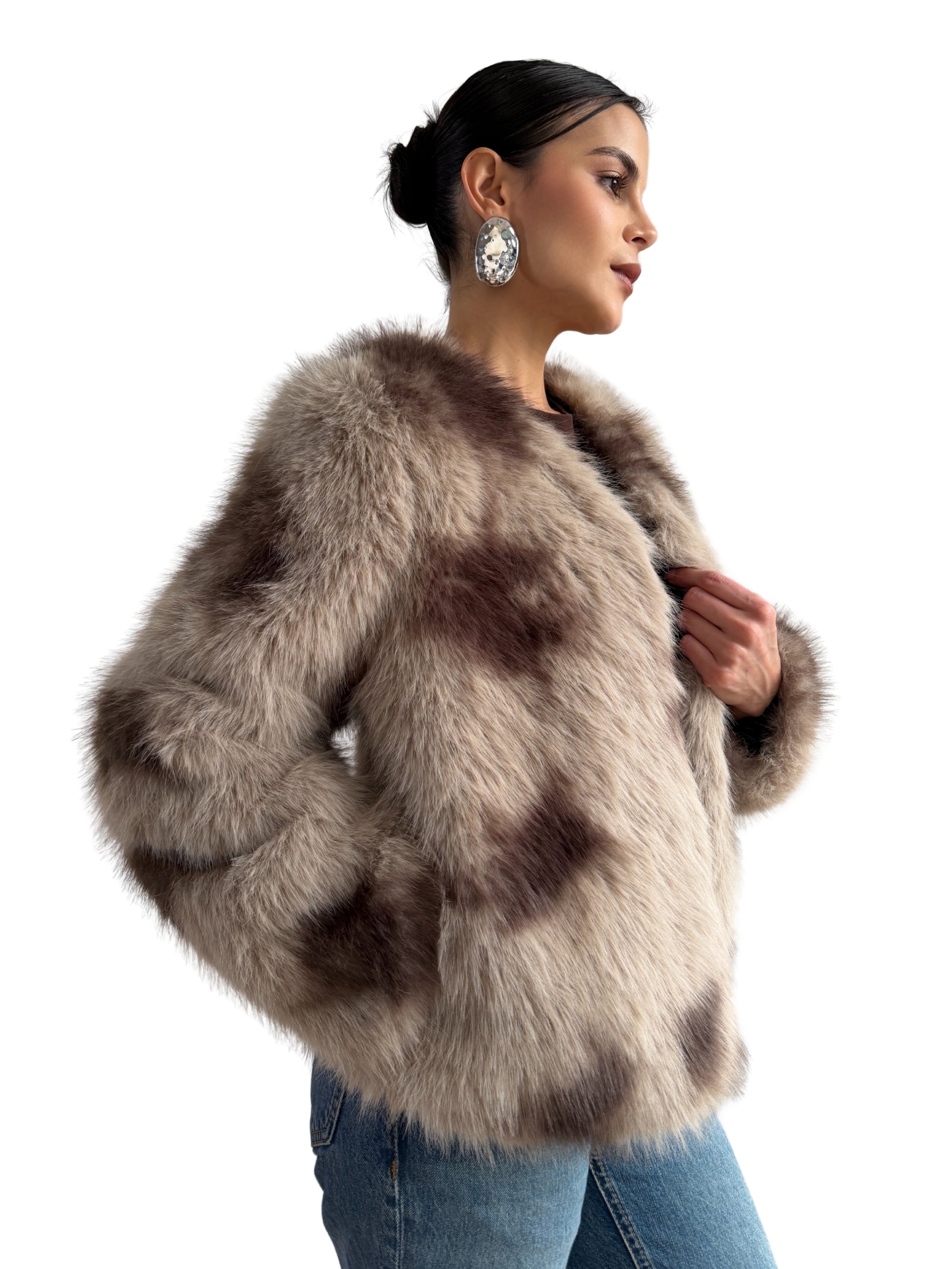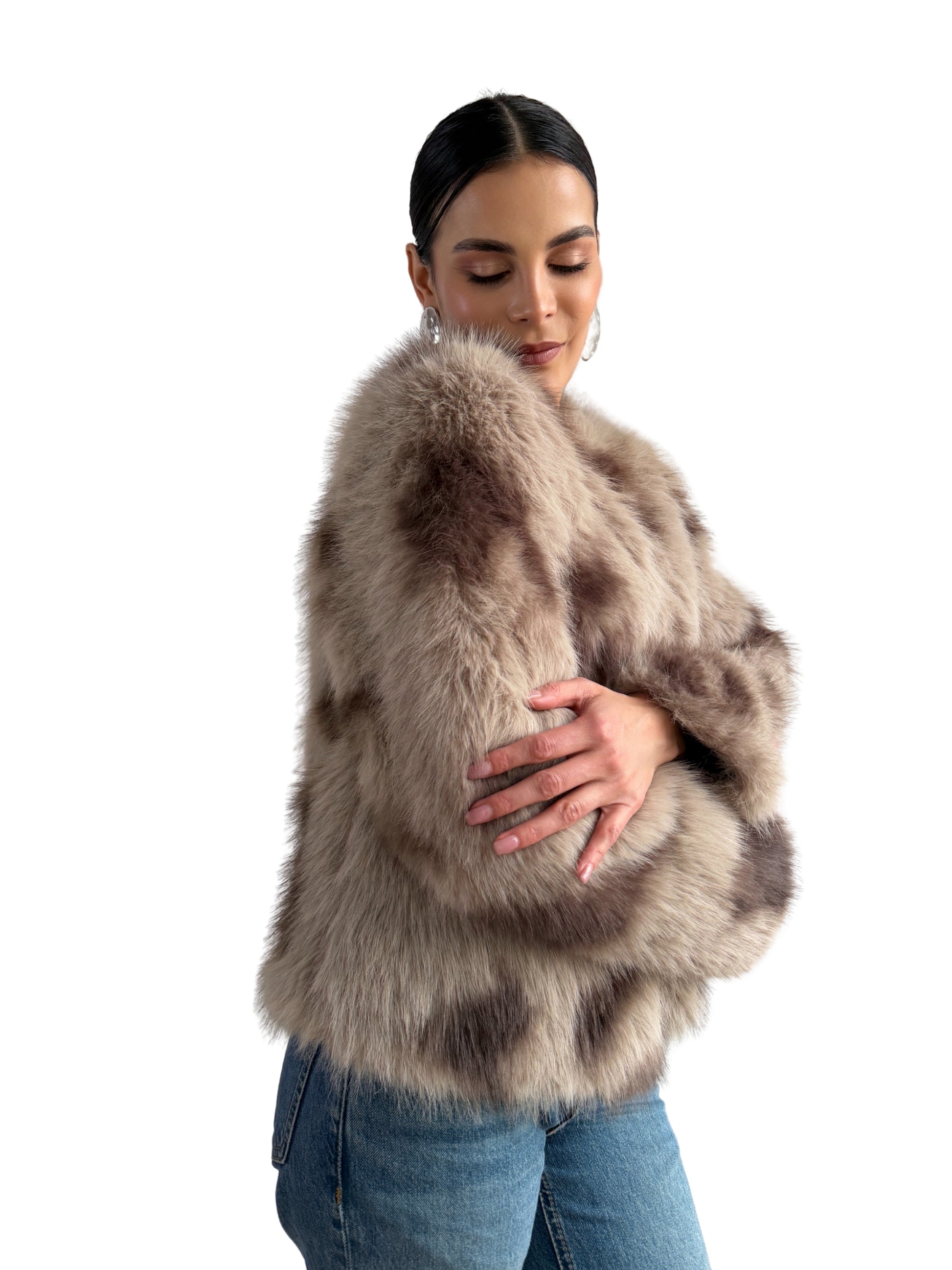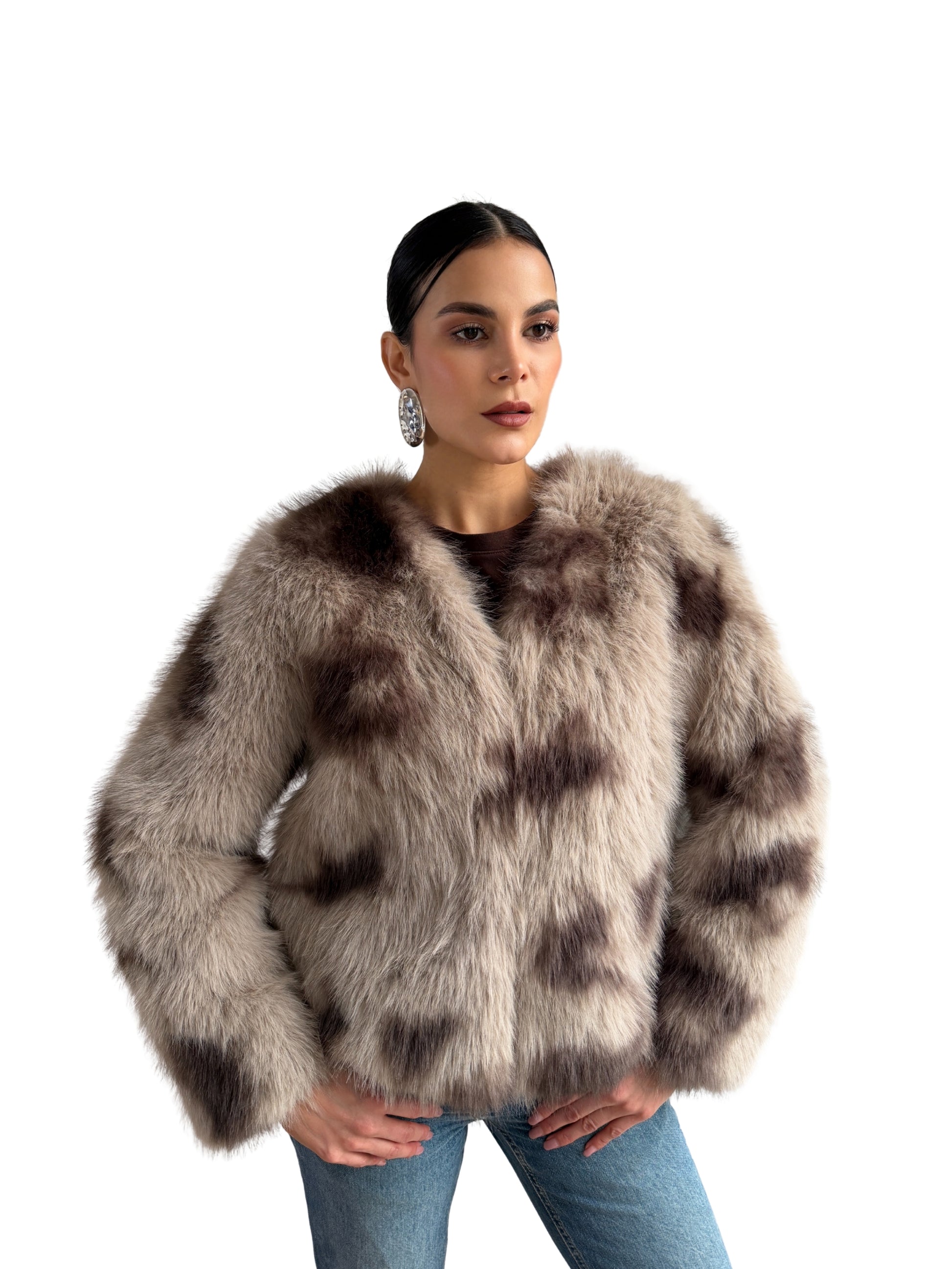 Este abrigo corto Animal Print Beige con manchas marrón es la mezcla perfecta entre audacia y sofisticación. Su textura suave y cálida lo hace ideal para cualquier ocasión, mientras que los acabados interiores en cuerina le añaden un toque de lujo y durabilidad. Su corte corto permite versatilidad en el look, siendo perfecto para combinar con jeans, faldas o vestidos. Un abrigo unico.