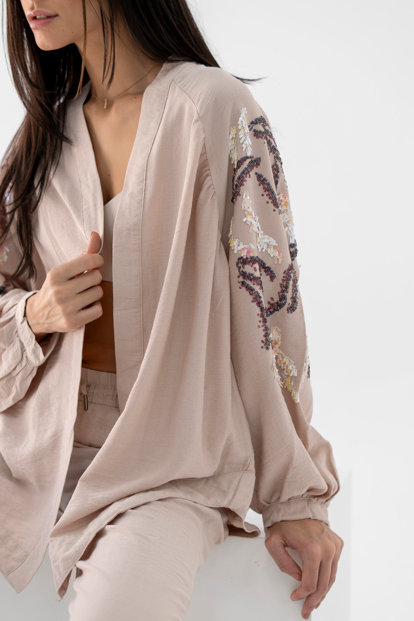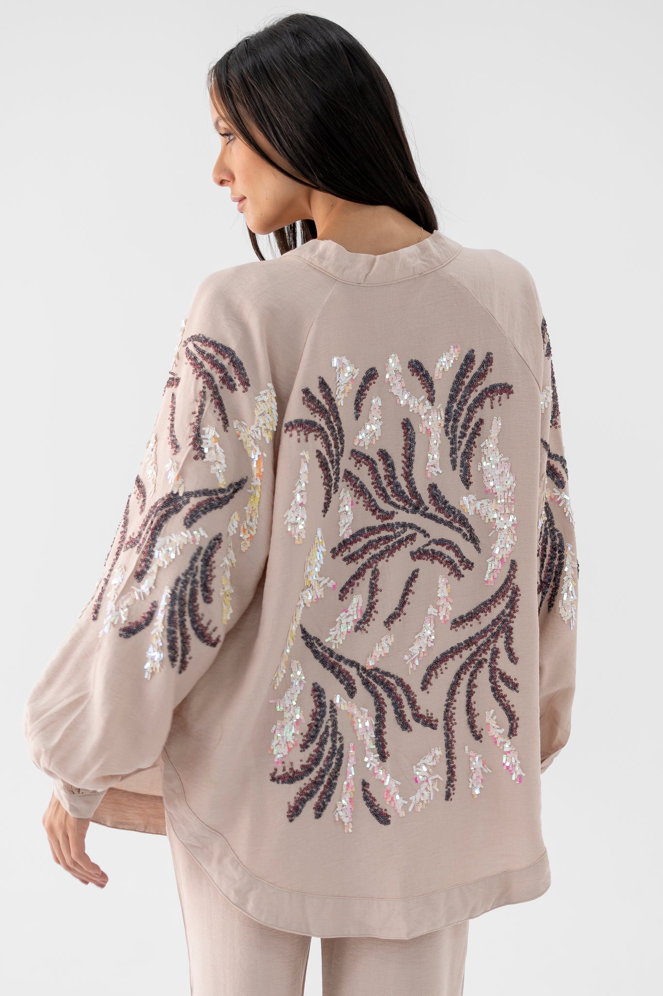 El blusón, con un delicado estampado de lentejuelas en forma de árbol y ramas, captura la esencia de la naturaleza con un toque de brillo sutil que refleja luz y movimiento. El pantalón de corte fluido completa el conjunto con comodidad y estilo. Ideal para quienes buscan una pieza versátil que combine frescura y elegancia en cualquier ocasión, este set es perfecto para un look chic y lleno de personalidad.