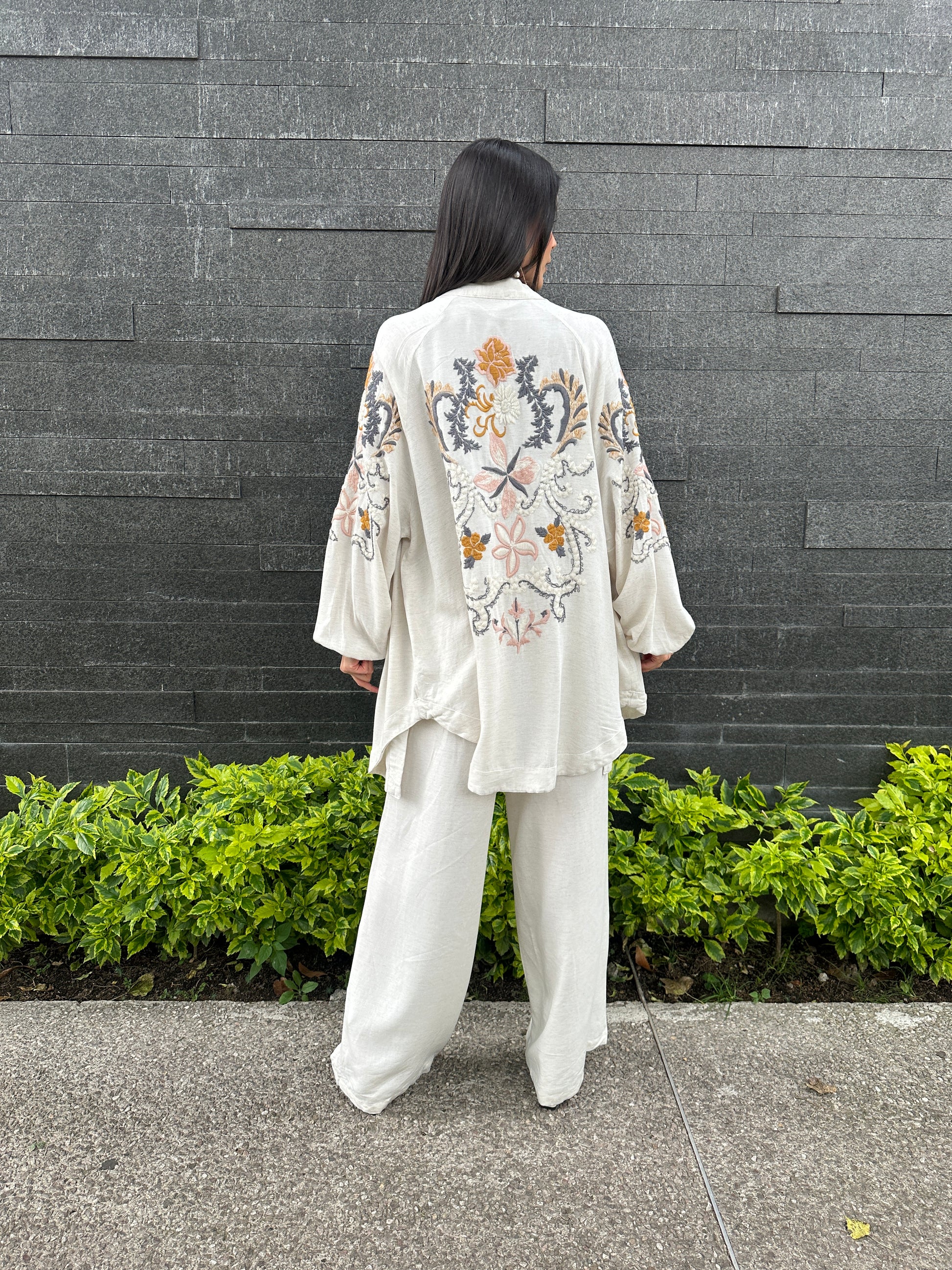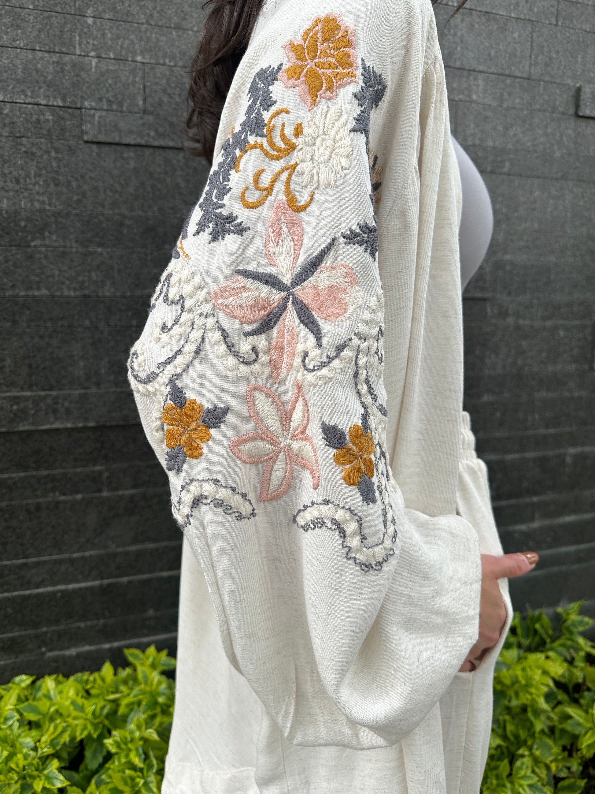 El blusón, de corte amplio y silueta relajada, destaca por sus bordados florales llenos de color en la espalda y mangas. Tonos cálidos y contrastantes recrean motivos naturales que aportan vida y personalidad, mientras la base neutra mantiene su elegancia.