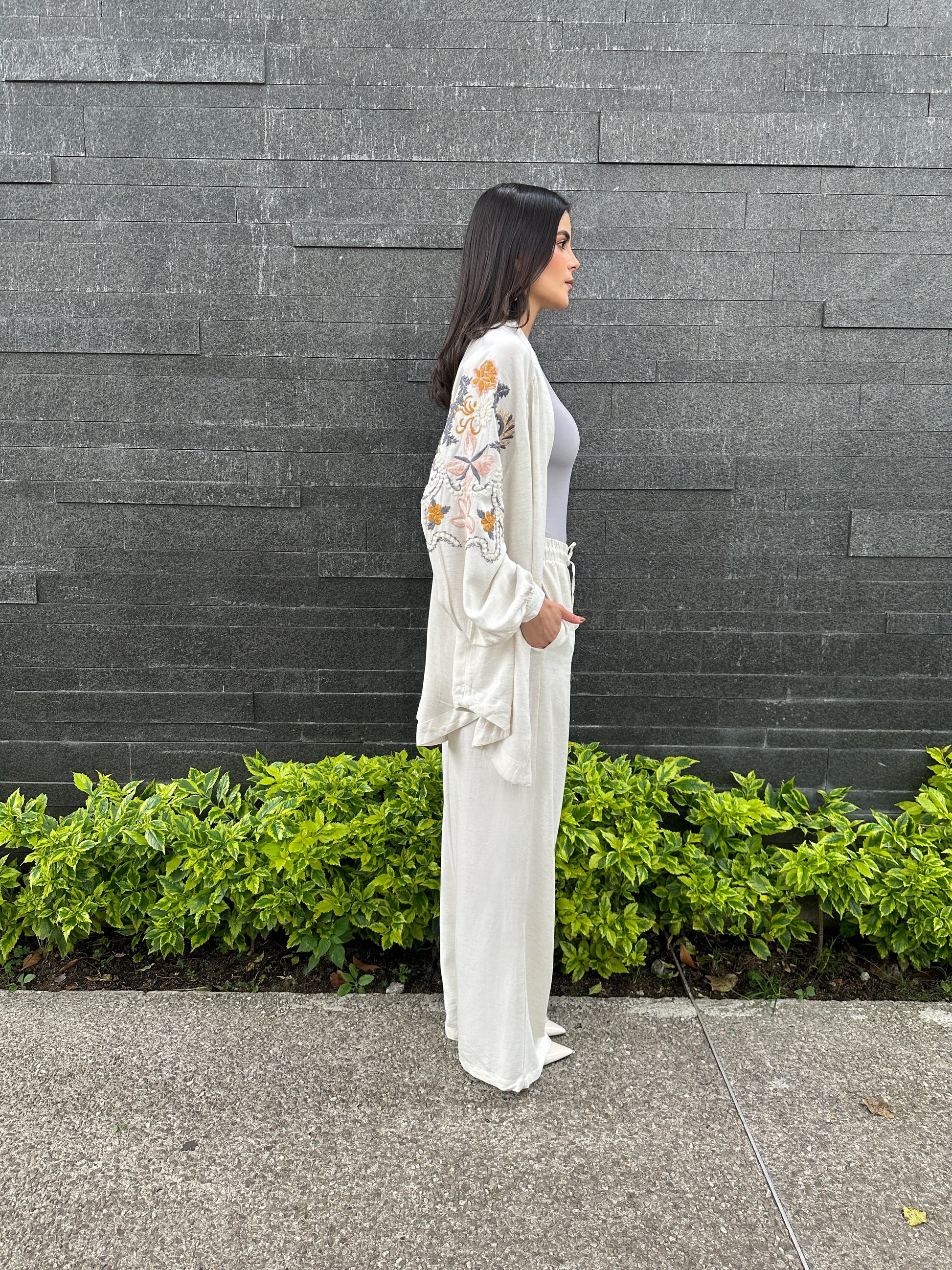 El Set Amaranta, compuesto por un blusón bordado y un pantalón de pierna amplia, celebra la esencia boho chic con un toque alegre y artesanal que ilumina cualquier look.